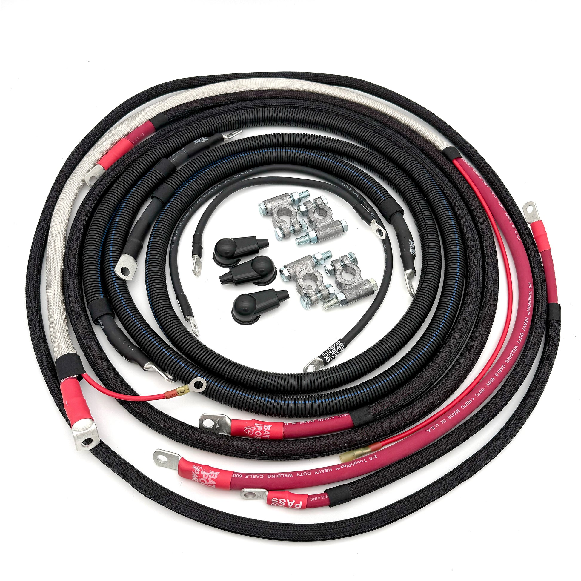 We're nerds for specs and finer details around here. None of that CCA (copper-clad aluminum) that's used in inferior products, or stereo installations. We only use fine-strand, SAE (Society of Automotive Engineers) approved, pure copper cable. Then using a powerful electromechanical crimping machine, we crimp each solid-copper end, and finally finish the construction by adding a environmental seal made of marine grade heatshrink meeting MIL-I-23053/4. Also included are military style corrosion resistant battery connections and an ANL fuse and holder. To make the entire install simpler, every end will be labeled for ease of installation.